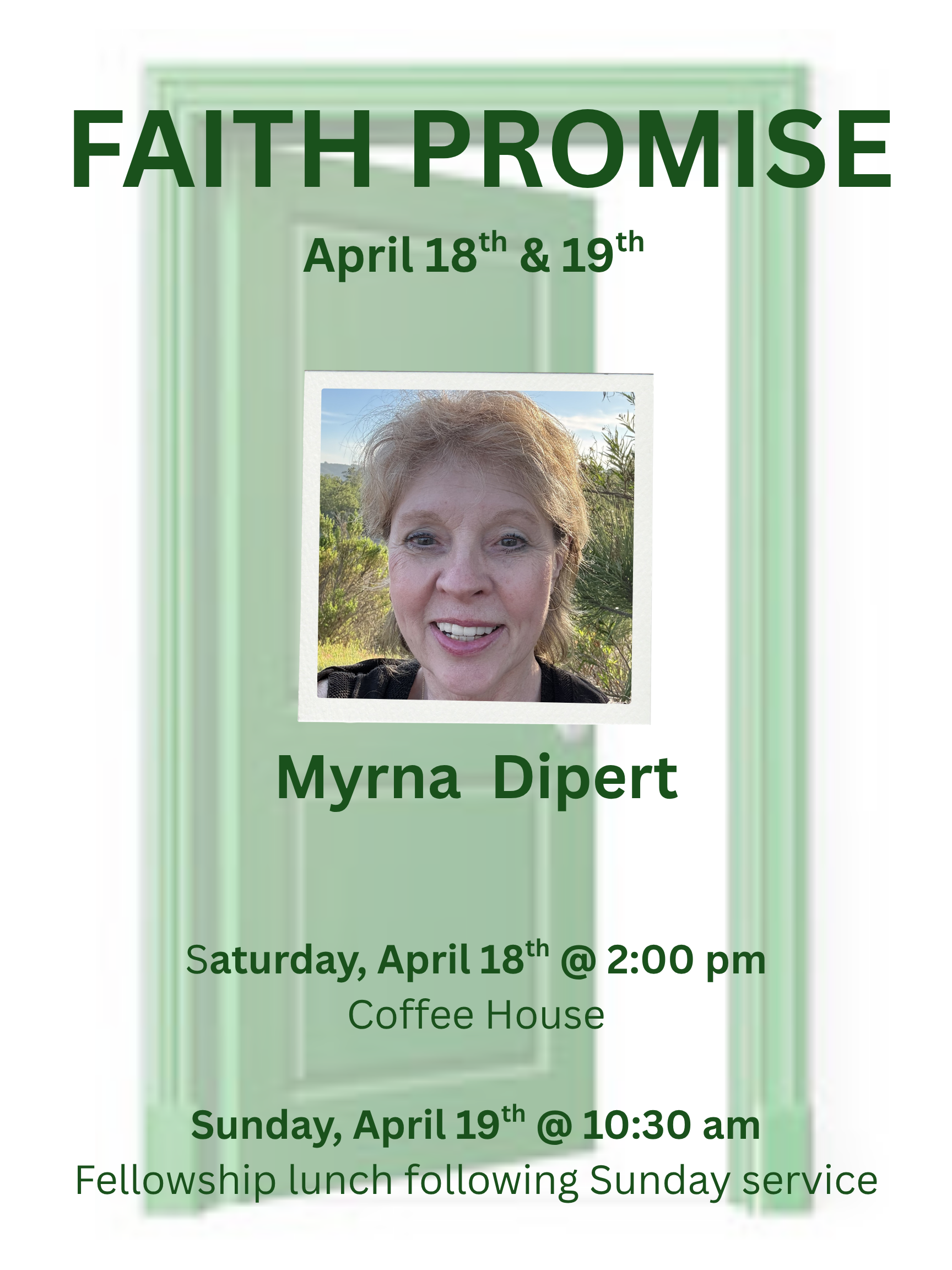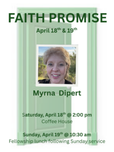 Sunday, April 19th, Myrna will be presenting during our Sunday morning service that begins at 10:30 am. All are welcome to attend. Following the morning service, there will be a Fellowship lunch.